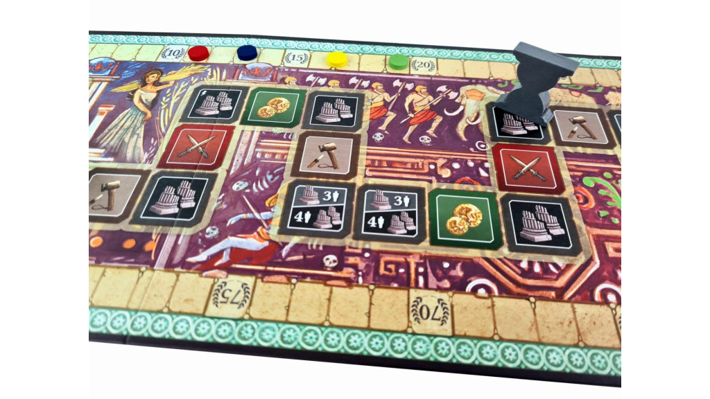 - 120 erőforrásjelző (plusz tartalék) – 35 búza, 30 fejsze, 30 kalapács és 25 érme; mind fontos, és mindből mindig kevés van.