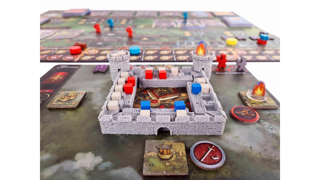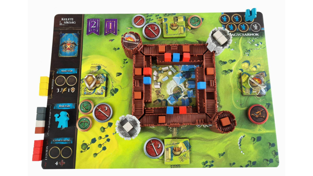 - 4 játékostábla – mindenkinek saját várfallal, saját problémákkal.
