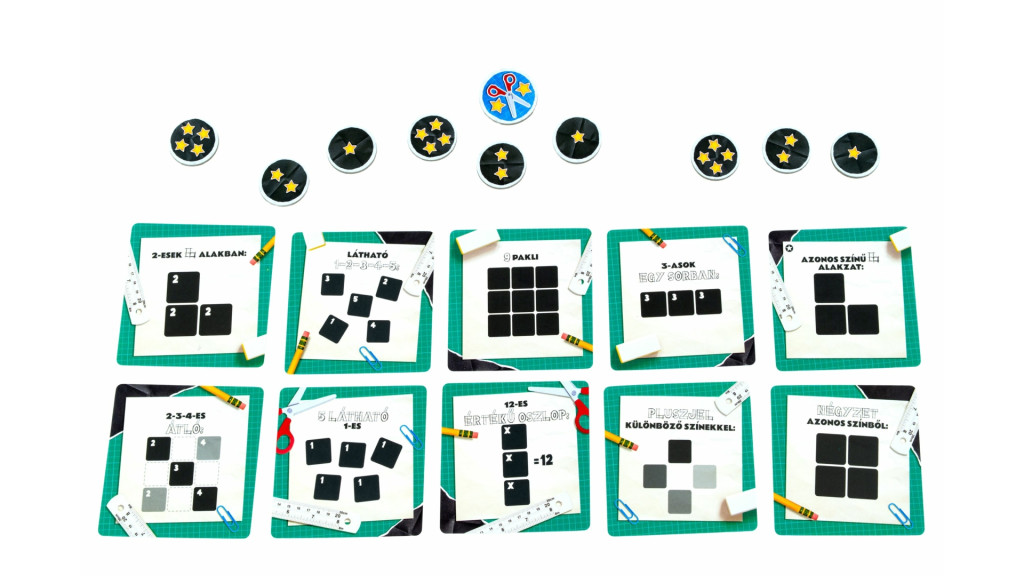 - 3 szett pontjelző (egy-egy 4, 2 és 1 pontos) – hogy szépen összeálljon a játék végi értékelés.