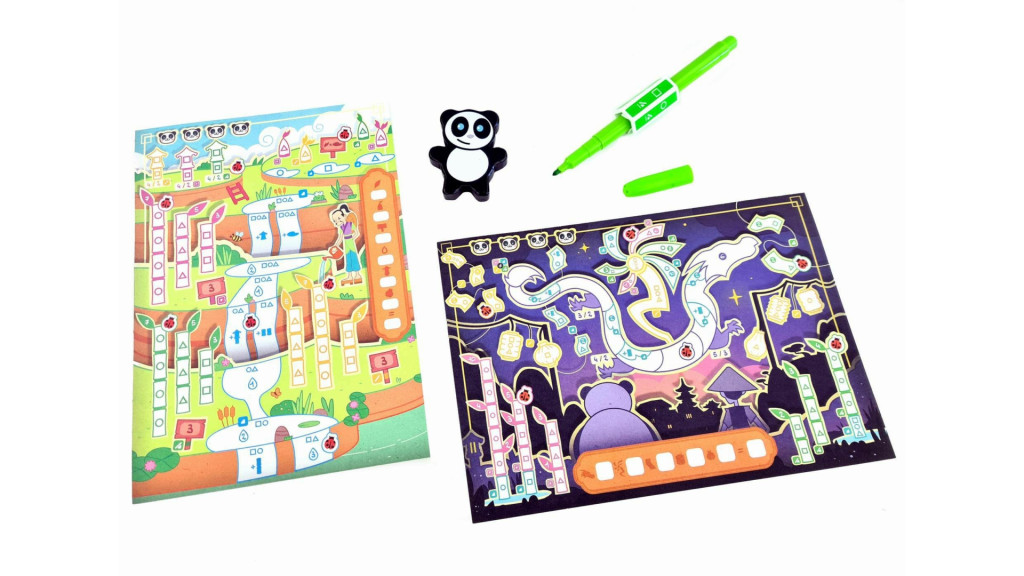 A játék menete gyorsan átlátható. A pandafigura jelzi, hogy ki választhat először filctollat az adott körben, a gyűrűk pedig azt mutatják meg, melyik mintát vagy területet lehet éppen beszínezni a lapon. Ez együtt adja a kör ritmusát: a szín kiválasztása után máris indulhat a rajzolás, és az eredmény azonnal látszik mindenkinél.
