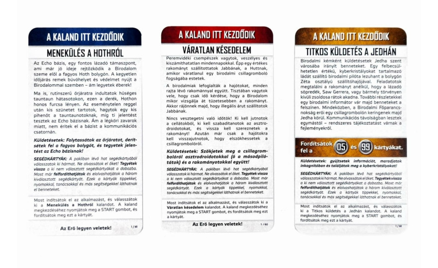 A dobozban három különböző Star Wars történet vár: egy szövetségi feladat a Lázadóknak, egy izgalmas kaland a csempészeknek, és egy kihívás a Birodalom oldalán. Mindegyik tele van fejtörőkkel, ikonikus helyszínekkel és karakterekkel – igazi rajongói csemege.